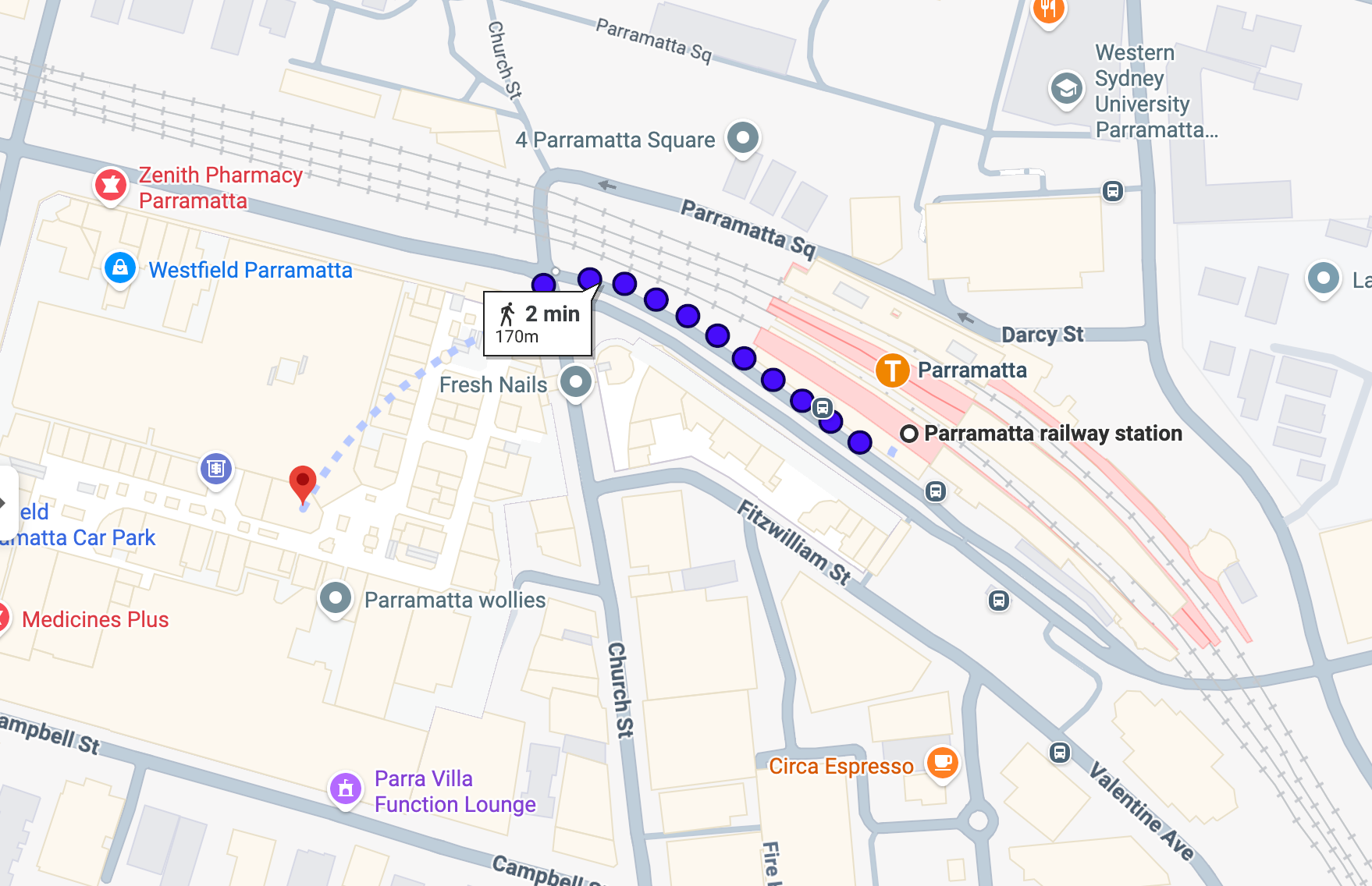 Parramatta Station is a 2 minute walk to Grill'd and Timezone which are both located inside Westfield Parramatta.