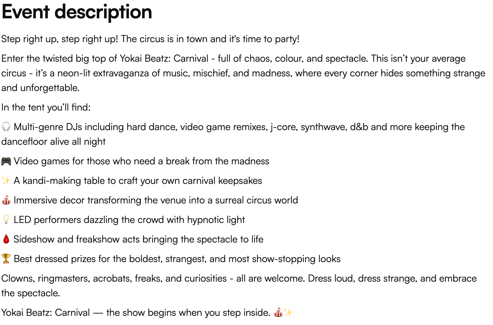 • This event will be loud with fast and hard music playing , people dancing and people wearing costumes.