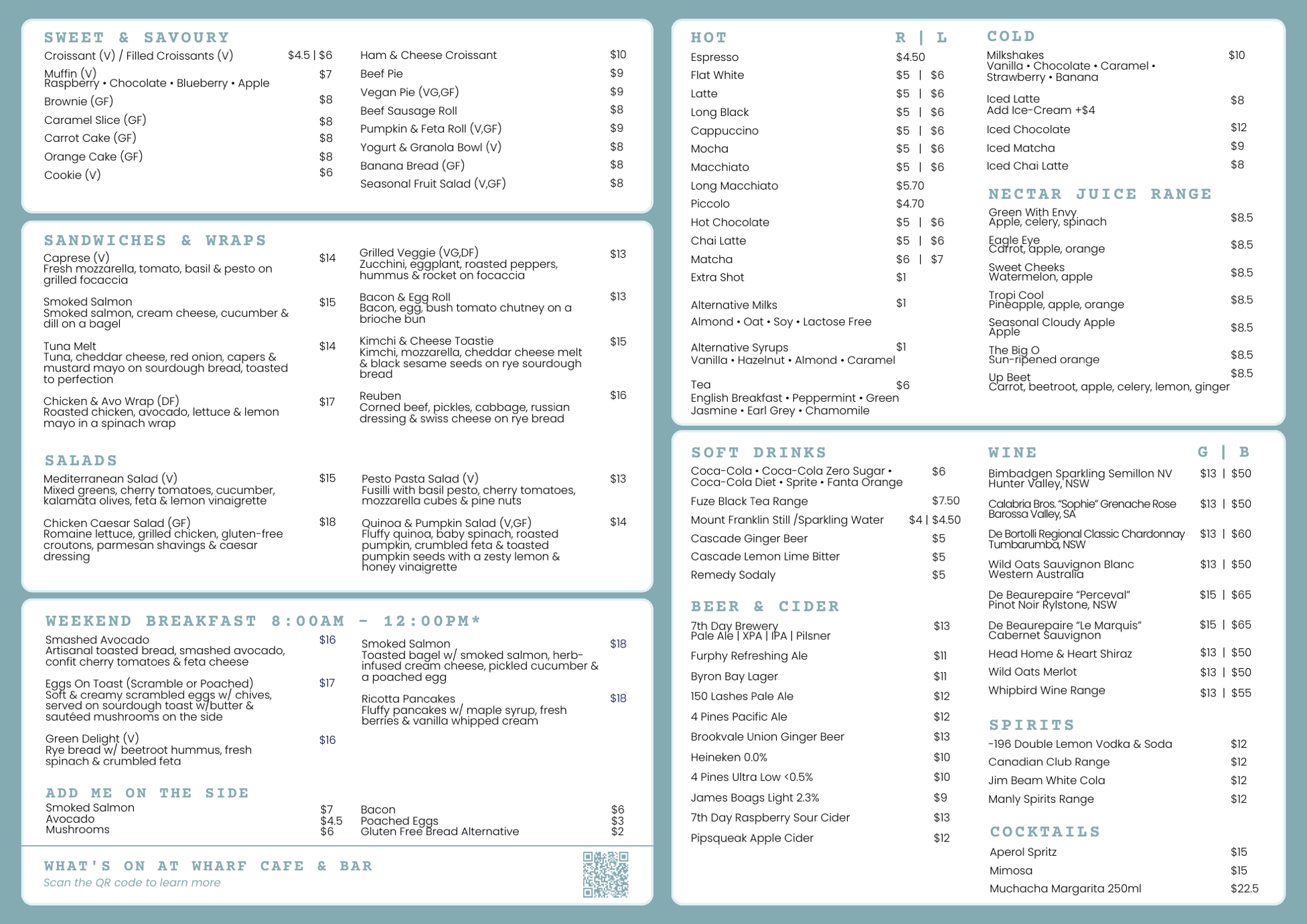 Food: We will be having lunch from the Wharf Bar & Cafe. Please view the menu here (you can zoom in):